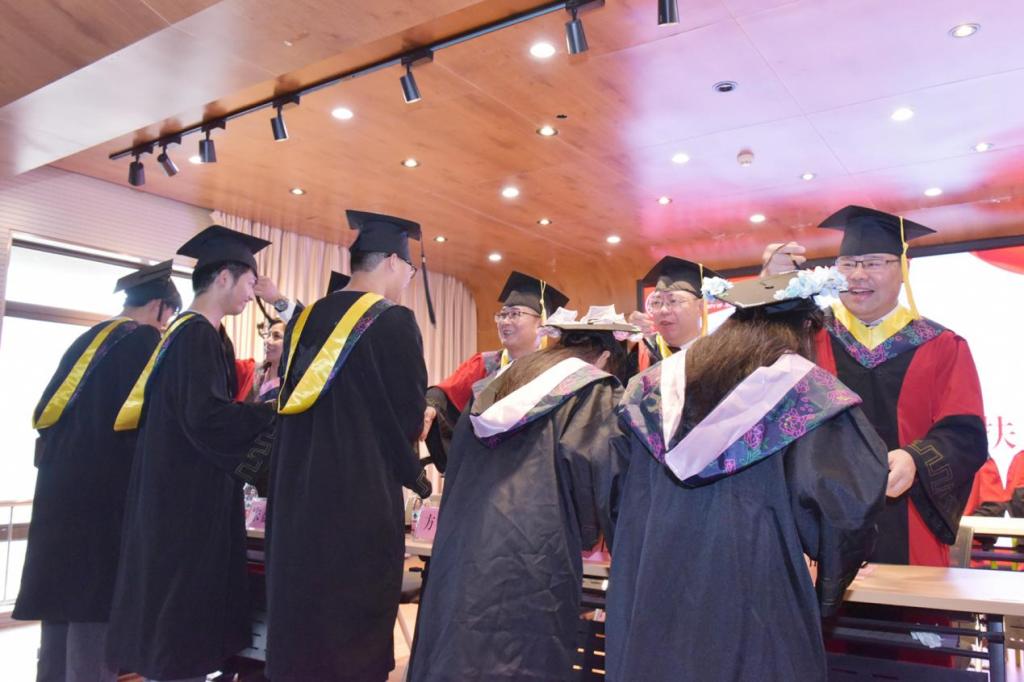 在庄严的音乐声中,参会领导为2024届毕业生逐一拨穗正冠、颁发毕业证书、授予学位并合影留念。