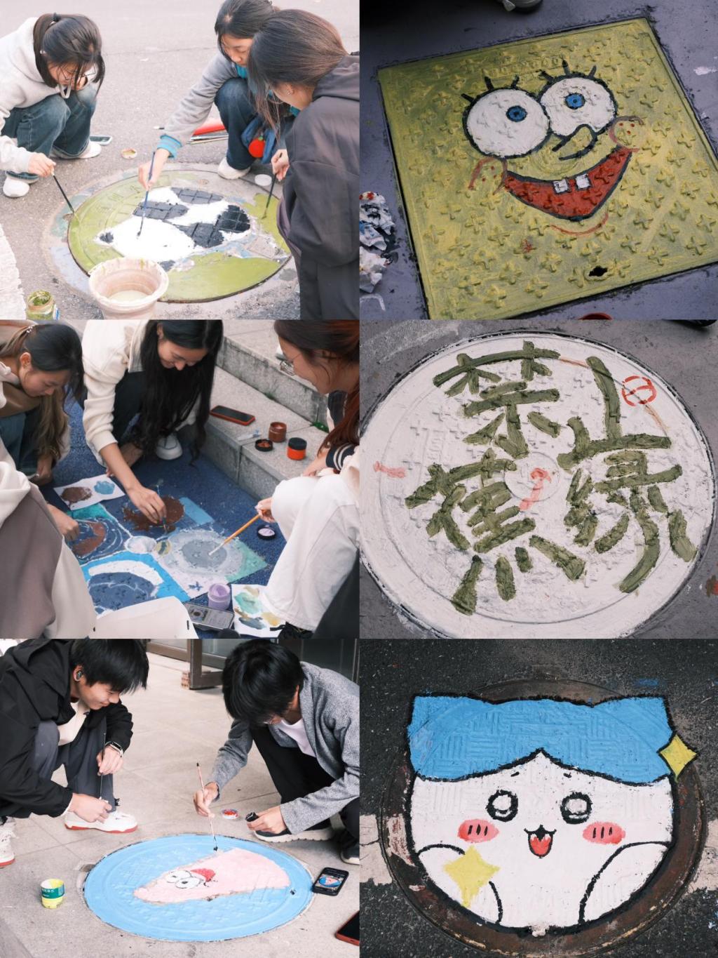 活动现场,同学们热情高涨,他们拿起画笔,在井盖上描绘出各式各样的图案。这些图案既有抽象的艺术表达,也有具象的可爱形象,每一个井盖都被赋予了新的生命和色彩。在同学们的巧手下,原本不起眼的井盖变成了校园内一道亮丽的风景线,不仅美化了校园环境,还为校园增添了一份艺术气息。