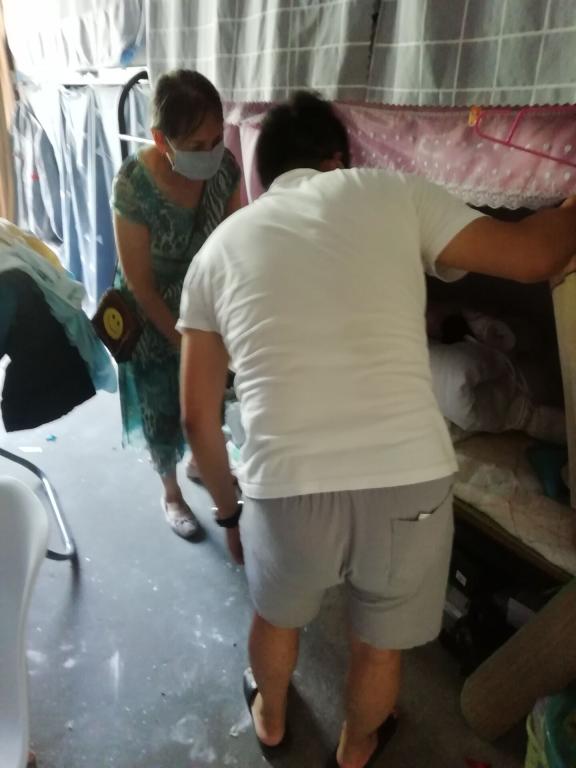 辅导员李亚飞和宿舍管理员王连华首先统一打开宿舍门和阳台的门窗进行通风,连续对宿舍通风两天,并计划开学前两天再对学生宿舍通风一天,保证宿舍空气对流三天,最大化去除屋内的湿气和霉气;其次对学生被褥逐个做检查与整理,对于出现发霉的床铺,两位老师将发霉的被褥、席子拿到广场或阳台晾晒并拍打掉被褥上的霉菌,为防止出错,还在每条被褥上贴上事先准备好的标签;同时两位老师再次清理了宿舍各个角落里已开封的食品、水果或者其他垃圾,并将部分腐烂、风干、过期的食物清理出去;最后两位老师还检查每个宿舍中潜在的安全隐患,进一步检查学生宿舍内的桌椅、水电以及墙壁等设备设施情况。
