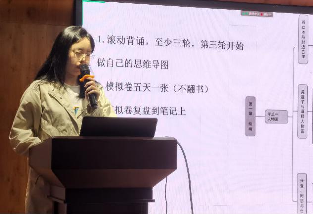 交流会上,学长学姐们从考研心理调适、公共课和专业课的复习方法、考研时间规划等方面展开分享。王子健建议同学们在考研压力下,要学会适当放松、松紧有弛,学会以从容心态面对考研,并以“纵有疾风起,人生不言弃”激励同学们迎难而上、踔厉奋发!成功考取南京大学的宋洁与成功考取南京邮电大学的刘亮针对专业课应如何备考做了细致的分享,宋洁结合自身实际分享了详细的背诵规划安排,刘亮则从自身考研经历出发建议同学们要尽早开始手绘学习。成功考取合肥工业大学的陈光明对政治和英语的学习规划,分享了自己的心得体会。在最后的问答环节中,同学们就备考期间遇到的问题积极提问,学长学姐们倾囊相授,积极传授学习经验,现场气氛活跃。