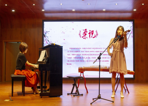 的陈子扬带来的钢琴独奏。他们分别演绎了一中一外两首曲目《彩云追月》和《热情奏鸣曲》,悠扬的琴声和热情的旋律感染了在场的同学们。随着贝多芬《热情奏鸣曲》最后一个音符落下,大家都纷纷起立鼓掌,沉浸并回味着这一场听觉盛宴……