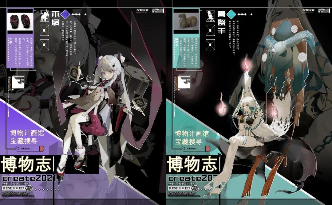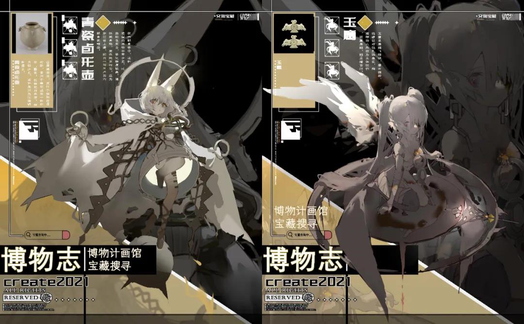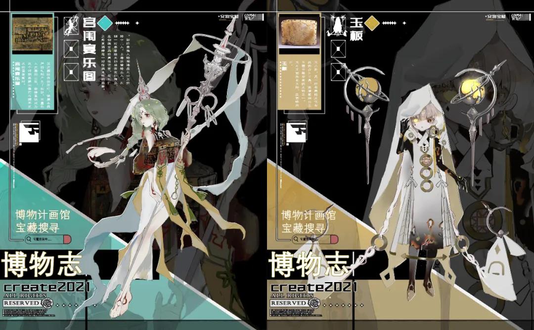 设计说明:通过把文物转换成游戏人物的方式,以达成用新媒体渠道用更容易传播和推广的形态把文化推向更高更广阔的平台的目的。从文物身上提取元素以及通过调查搜集大量的资料再结合文物本身的时代背景用途或者更深层次的文化内涵,把虚幻的内容无法直观转换成图像的内层意义可视觉化,以此为地基和标准,再以业内游戏需求审美衡量来设计人物。