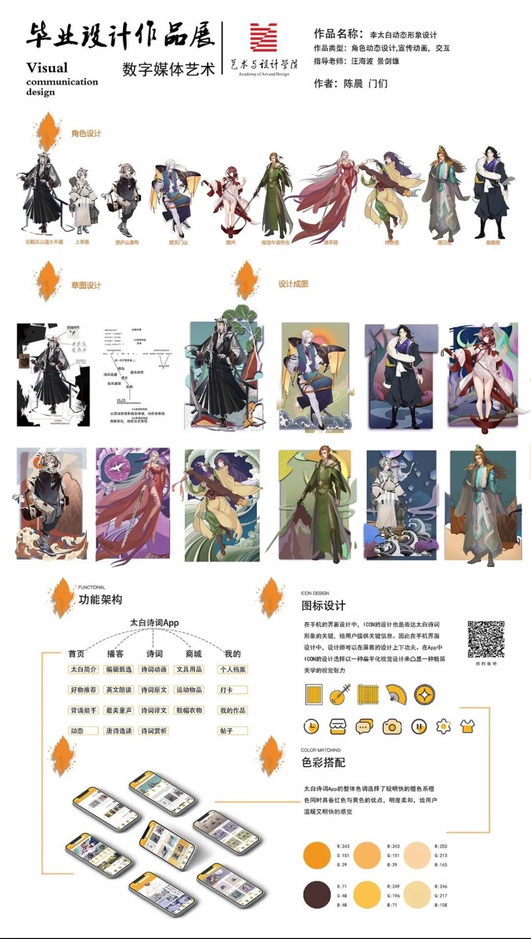 设计说明:这是基于诗歌可视化的角色形象设计再造,通过诗歌中不同的意象符合来描绘李白人物形象,借助太白角色中各具特色造型、道具、表情等将诗文中主观的、看不见摸不着的情感转换为客观的、可听可见的物质形态。李白动态角色形象设计实现诗歌可视化,将静态的信息转化为具有冲击力动态视觉形象,数字化地呈现在受众眼前,让受众从多维度理解诗文信息,打破传统枯燥、乏味的诗文学习方式,充分展现诗歌信息的价值,提高信息的可读性与时效性。利用手机App媒介,优化界面社结,传播马鞍山太白诗词文化。