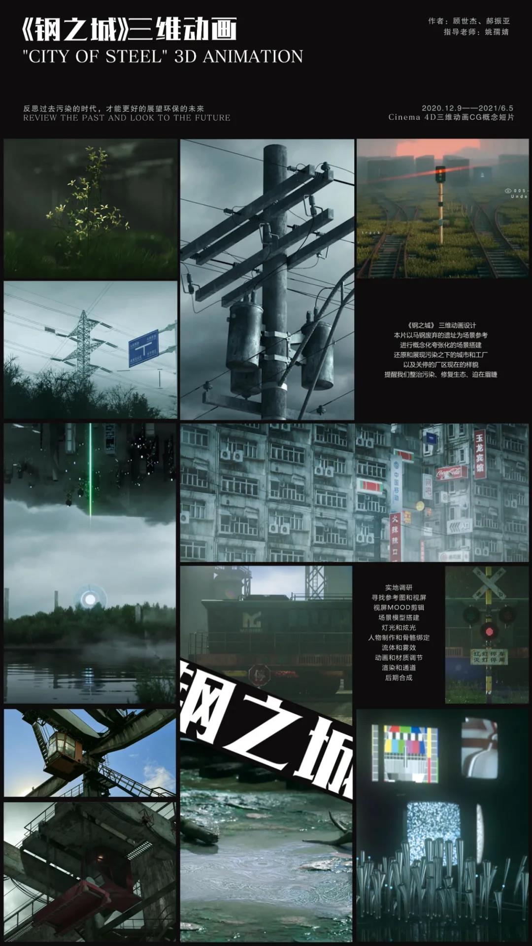 设计说明:本片以马钢废弃的遗址为场景参考,进行概念化夸张化的场景搭建,还原和展现污染之下的城市和工厂,以及关停的厂区现在的样貌,提醒我们整治污染、修复生态、迫在眉睫。引导人们去思考人与工业与自然之间的关系。