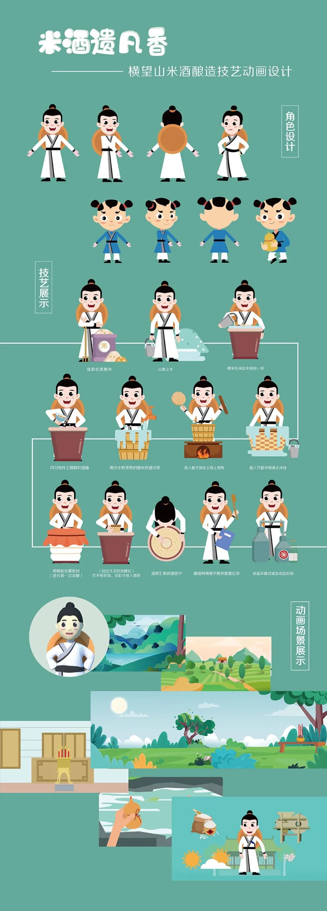 根据横望山米酒酿造技艺的传说和工艺,从《当涂县志》中提取人物形象,设计出动画的主人公