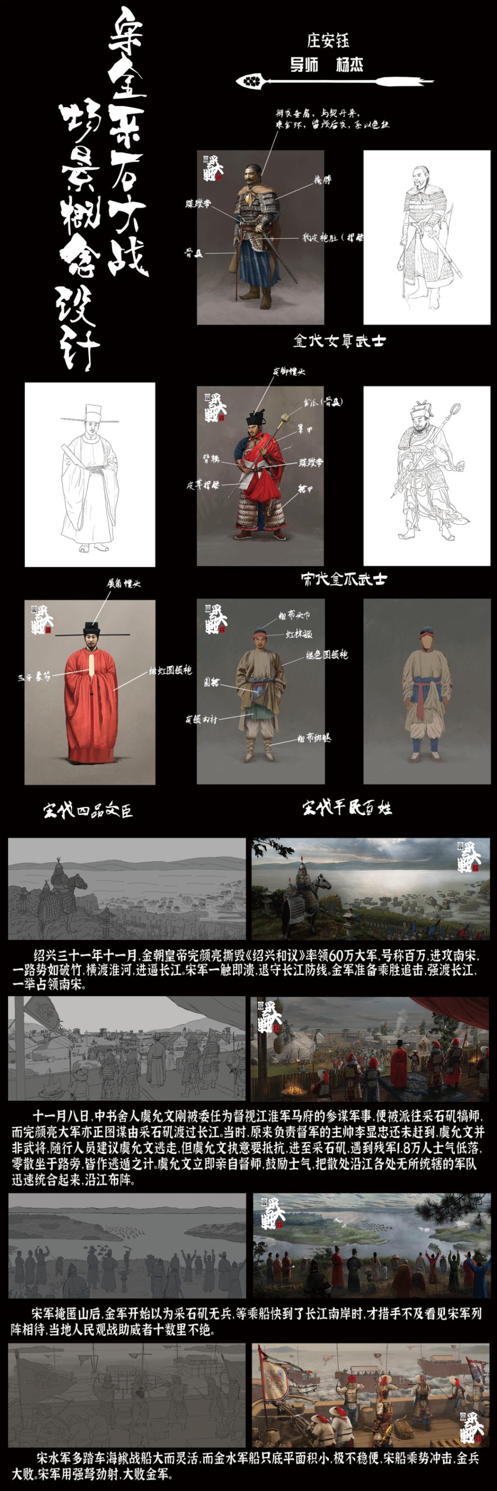 设计说明:本次毕业设计的主题是宋金采石大战,作为中国历史上,影响深远的战争之一,宋金采石之战的结果影响了中国的历史发展走向。而在这次战争中,宋金双方都拥有当时世界最强大的军事力量,古典时代的甲胄文化在此碰撞,杀伤力惊人的制敌利器在这场战争中激荡,随着国力的不断增强,中华民族伟大复兴的时刻终将来临,回想起唐宋古典时代的伟大辉煌,是点燃中国人心中大国崛起的豪情。本次毕设是想向人们宣传采石矶的宋金武备甲胄文化,重拾尚武气魄,学习祖先先进的武备文化,同时也推动马鞍山采石矶景区的景点建设、旅游文化建设以及促进地区经济发展。