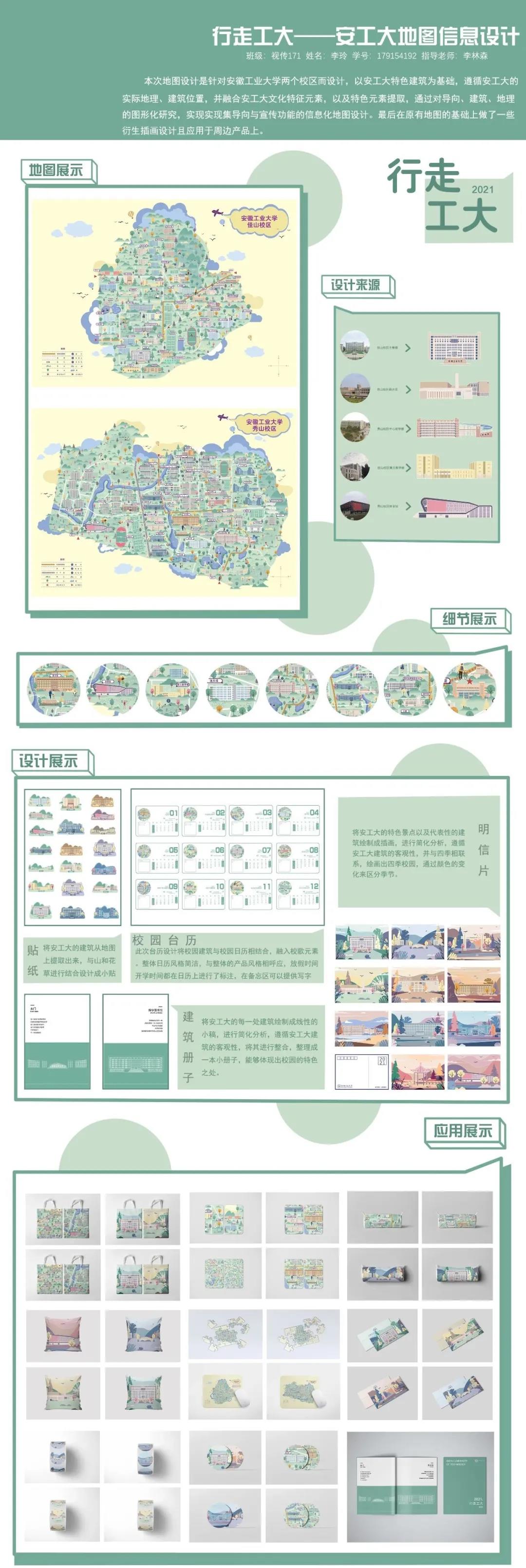 两个校区而设计,以安工大特色建筑为基础,遵循安工大的实际地理、建筑位置,并融合安工大文化特征元素,以及特色元素提取,通过对导向、建筑、地理的图形化研究,实现实现集导向与宣传功能的信息化地图计。最后在原有地图的基础上做了一些衍生插画设计且应用于周边产品上。