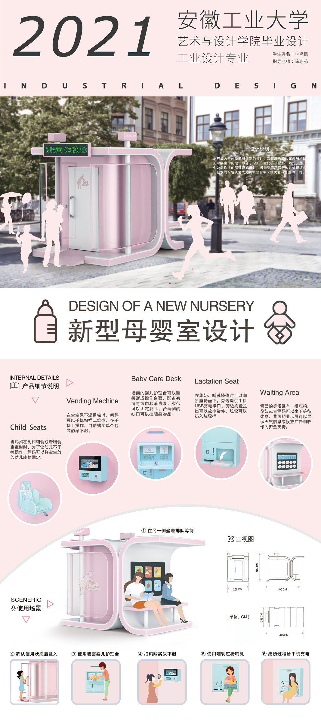 设计说明:此产品为一外 新型母婴室的设计,旨在解决公共露天场所缺乏母婴室的问题,服务于孕妇、宝妈、“背奶”妈妈,是一个公共性质的基础设施计,将母婴室浓缩与公共长椅结合,轻快的配色使之成为文明社会中充满关爱与尊重的一隅。