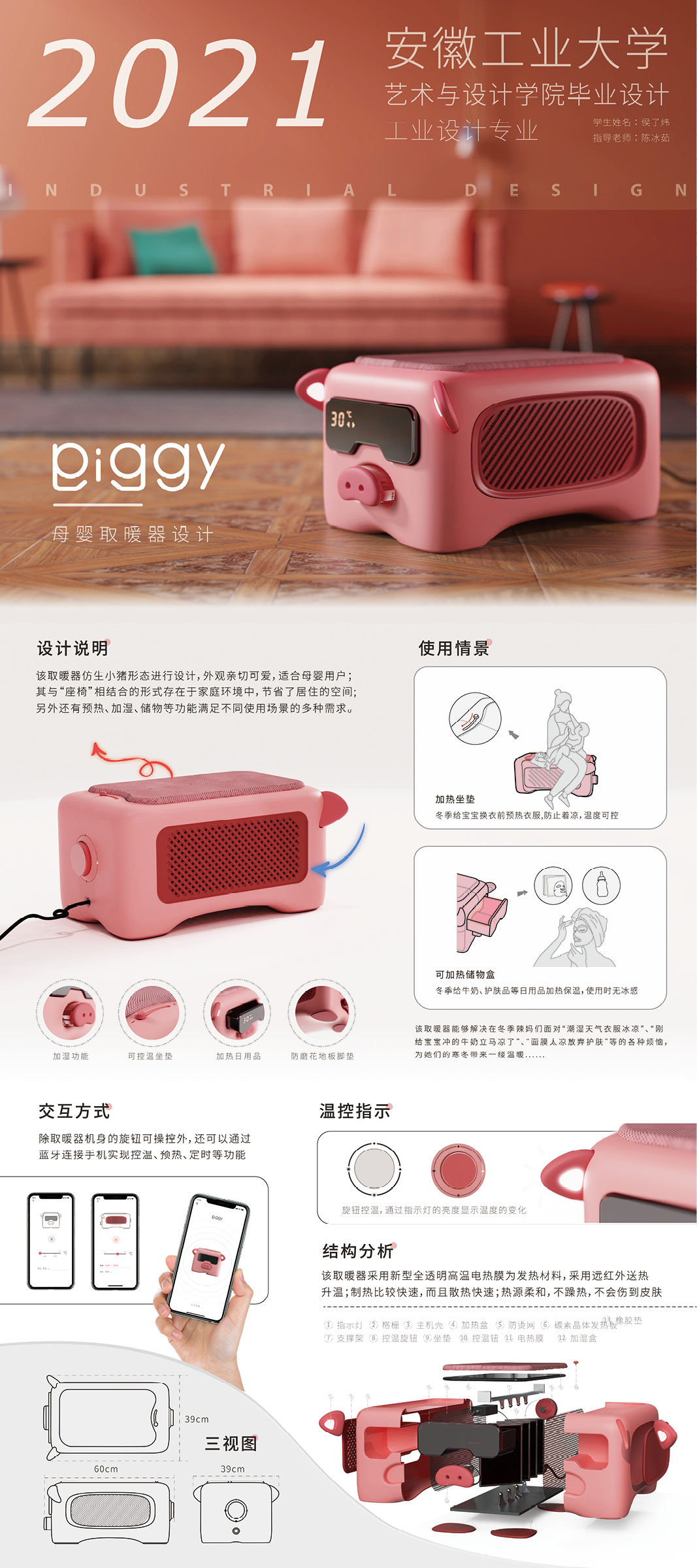 设计说明:取暖器仿生小猪形态进行设计,外观亲切可爱,适合母婴用户;其与“座椅”相结合的形式存在于家庭环境中,节省了居住的空间;另外还有预热、加湿、储物等功能满足不同使用场景的多种需求。