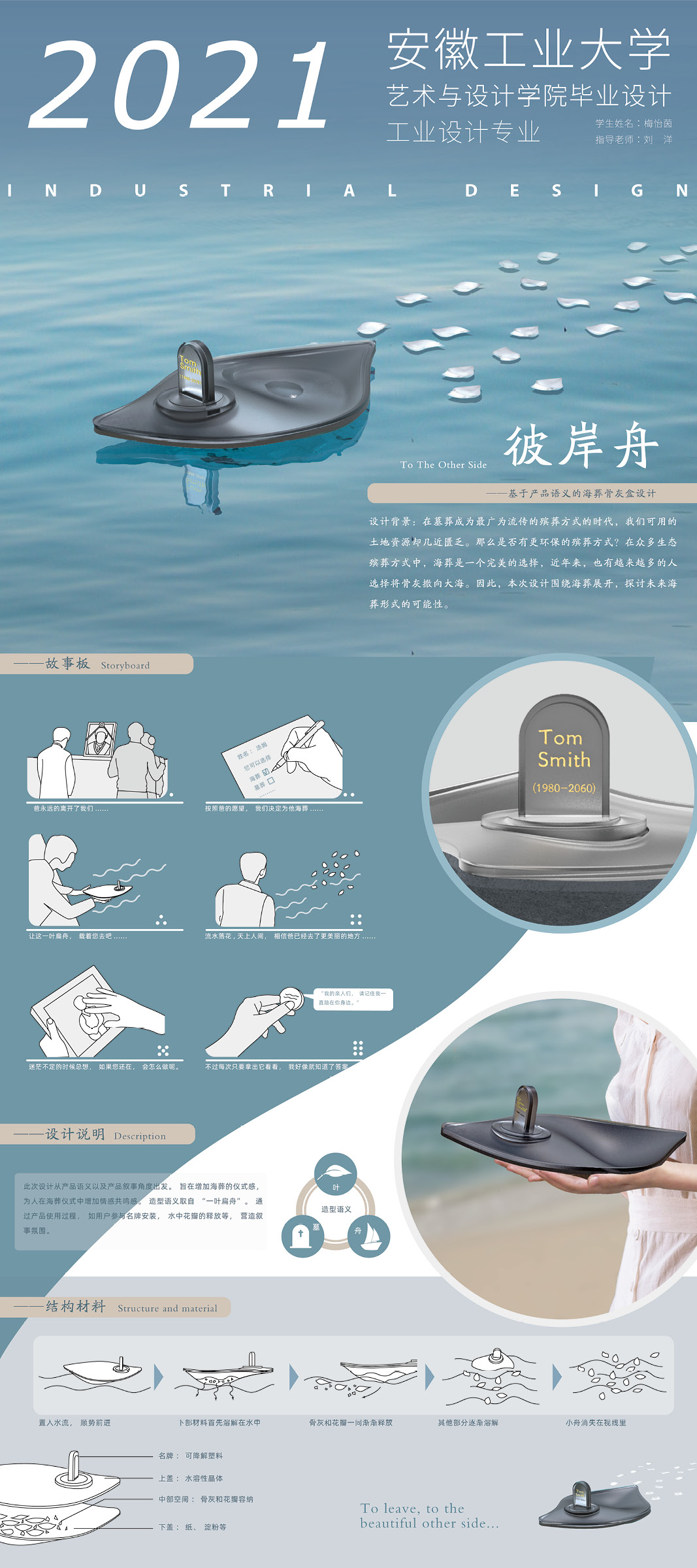 设计说明:本次设计围绕海葬展开,探讨未来海葬形式的可能性。此次设计从产品语义以及产品叙事角度出发。旨在增加海葬的仪式感, 为人在海葬仪式中增加情感共鸣感。造型灵感来自于“一叶扁舟”“水滴” ,通过产品使用过程, 如用户参与名牌安装, 水中花瓣的释放等,营造叙事氛围。