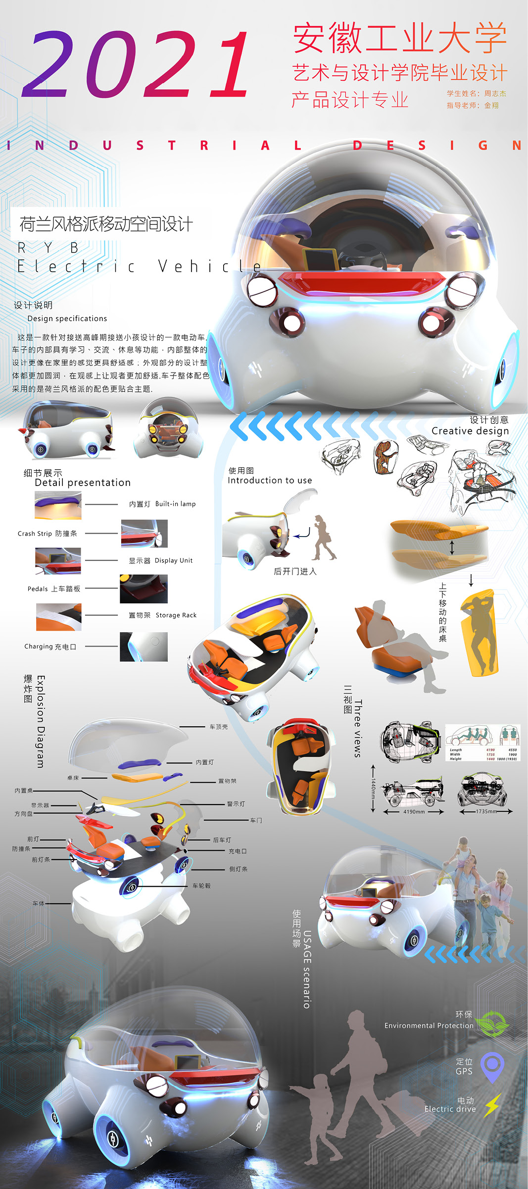 设计说明:这是针对接送小孩设计的一款接送电动车,车子的内部具有学习、交流、休息等功能,内部整体采用荷兰风格派的设计风格。高峰期接送让家长孩子更舒适。