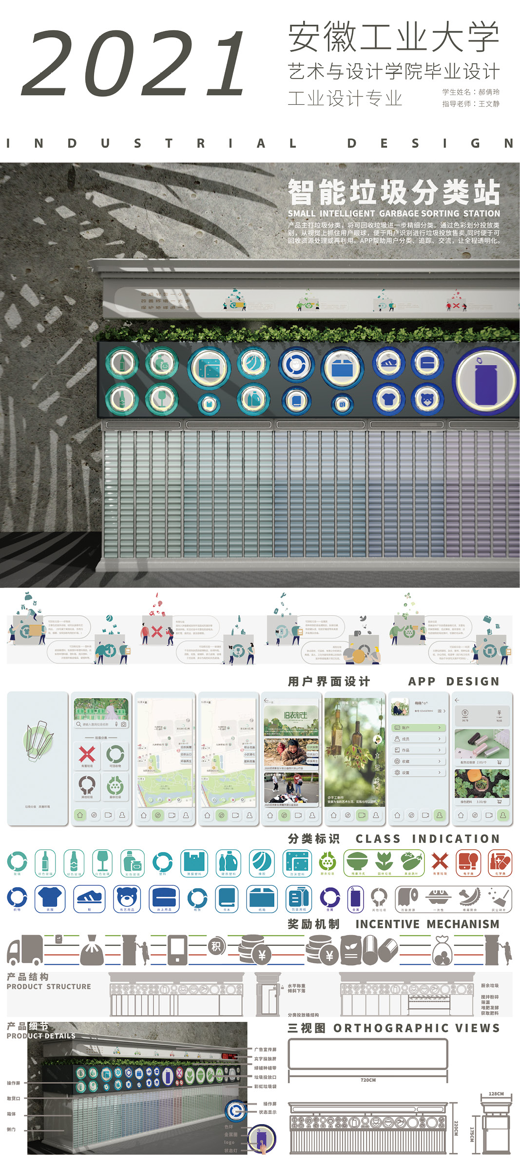 设计说明:产品主打垃圾分类,将可回收垃圾一步精细分类。通过色彩划分投放类,别,从视觉上抓住用户眼球,便于用户识别进行垃圾投放售卖,同时便于可回收资源处理或再利用。APP帮助用户分类、追踪、交流,让全程透明化。