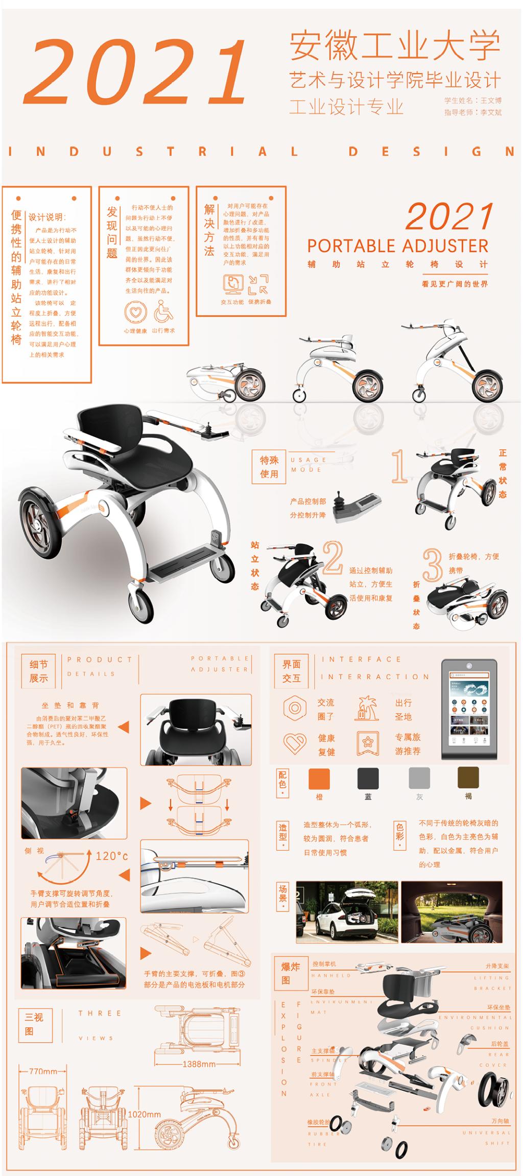 设计说明:产品是为行动不便人士设计的辅助站立轮椅,针对用户可能存在的日常生活,康复和出行需求,进行了相对应的功能设计。该轮椅可以一定程度上折叠,方便远程出行,配备相应的智能交互功能,可以满足用户心理上的相关需求。