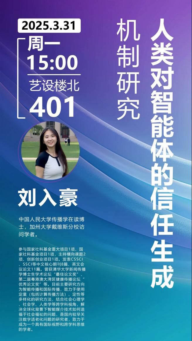 讲座题目:《人类对智能体的信任生成机制研究》