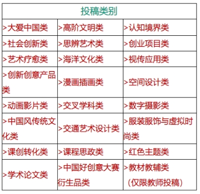 (系)为投稿单位,每个类别(论文类除外,论文类每个学生或老师,只能投稿一篇论文,且为未发表过,以及与创意、设计、数字媒体等相关专业有关的文章)最多投搞20件作品;教师组24个类别,教师作品投稿数量不限。